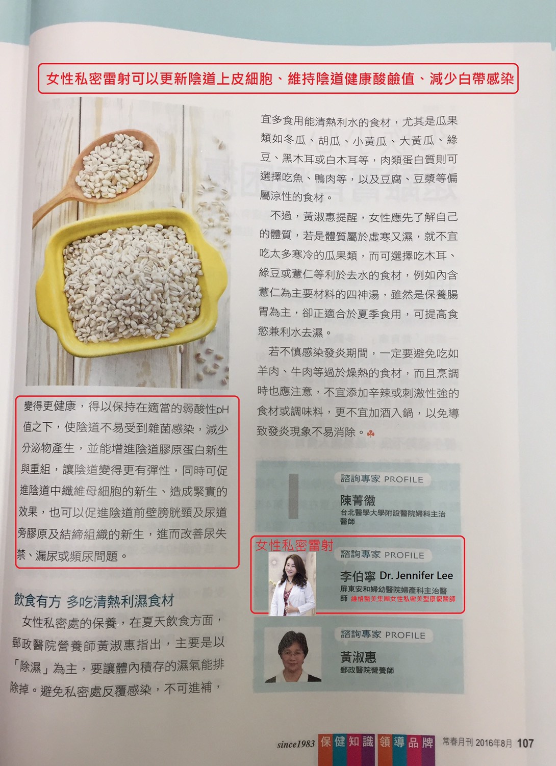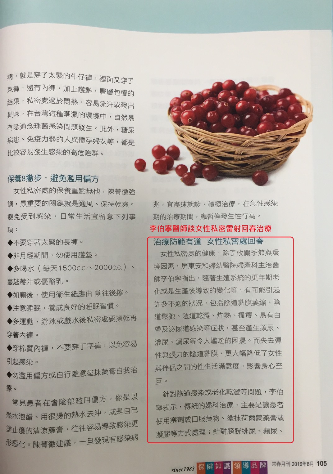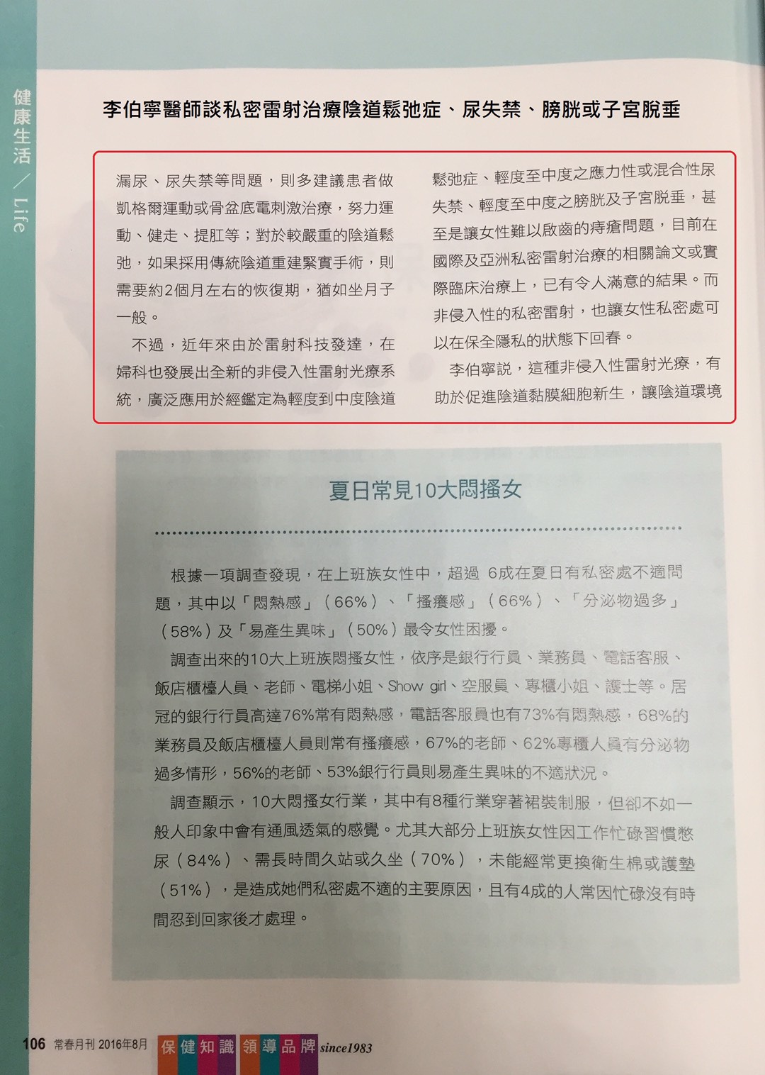 2016八月份台灣保健雜誌第一品牌常春月刊採訪李伯寧醫師談「女性私密雷射保養術」。夏日到了,如何保養私密處,大家ㄧ起來呵護咩咩